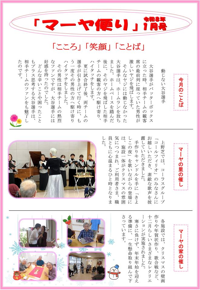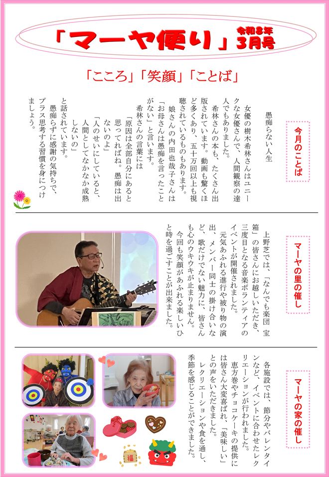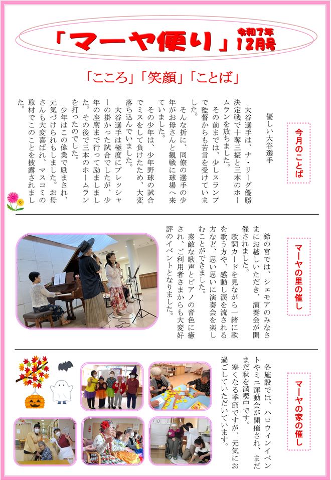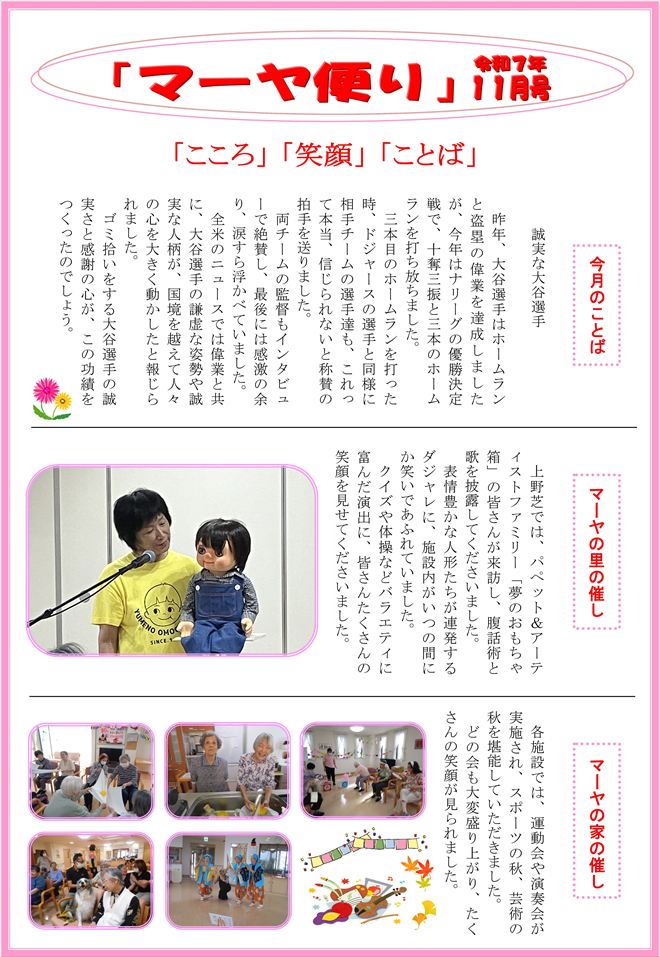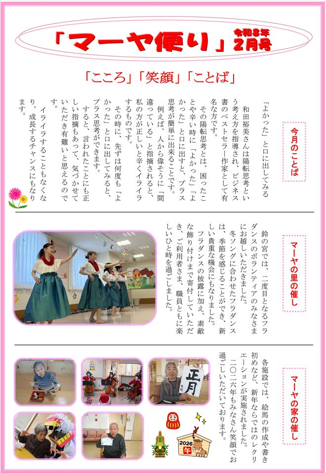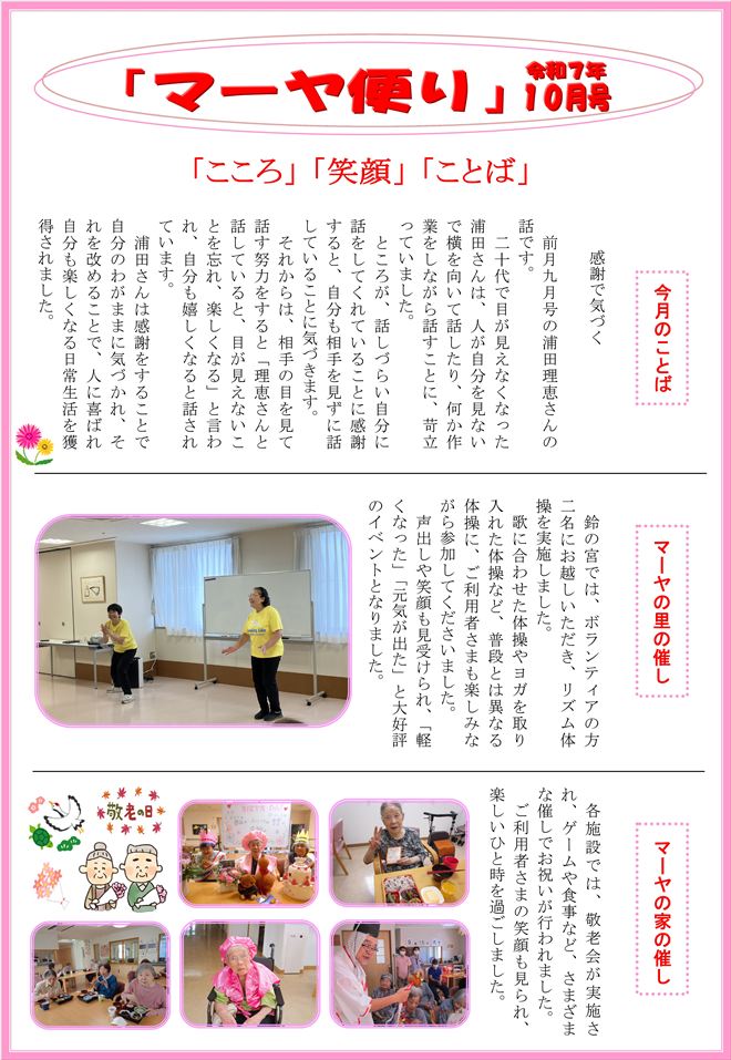 マーヤでは各施設の出来事や「今月のことば」を掲載した、施設新聞を毎月1回発行しています。ご利用者のご家族さま、介護事業者さま、病院の地域連携室の皆さまに配布し、お陰さまで好評をいだだき、「感動しました」の言葉を沢山いただいています。